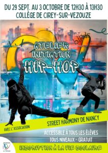 En parallèle de cette journée, un atelier d’initiation HIP-HOP sera animé par des danseurs (association Street Harmony)