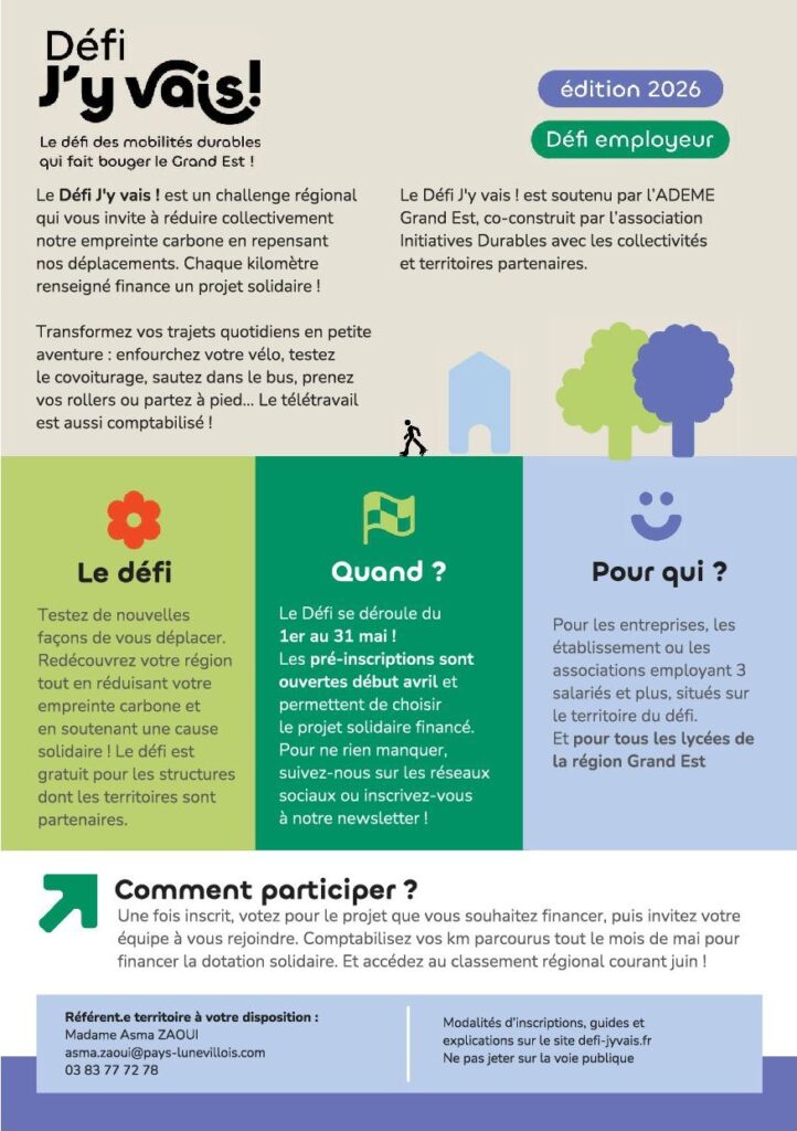 Le Défi J’y vais ! est un challenge régional qui invite les entreprises, les écoles, les collèges, les lycées et les collectivités du Grand Est à réduire collectivement leur empreinte carbone en repensant leurs déplacements. Chaque kilomètre renseigné finance un projet solidaire.